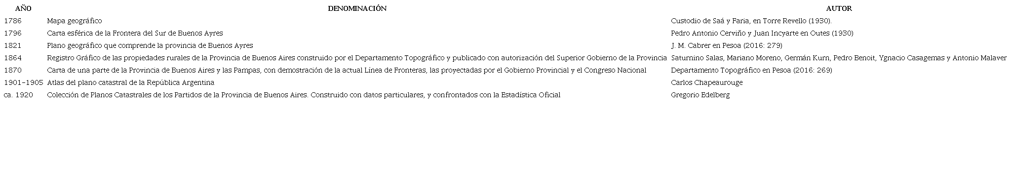 Debido a que el paraje El Siasgo ha sufrido modificaciones a lo largo del tiempo, otra línea de indagación que seguimos fue la revisión de cartografía elaborada en distintos momentos de los siglos XVIII, XIX y XX. Estos mapas revelan cómo se fue conociendo y administrando el territorio y nos permiten identificar ciertos cambios y continuidades respecto de su ordenamiento y de los elementos que se consideraron significativos en diferentes momentos (Garavaglia y Gautreau, 2011). Las cartas relevadas se sintetizan en la Tabla 1.