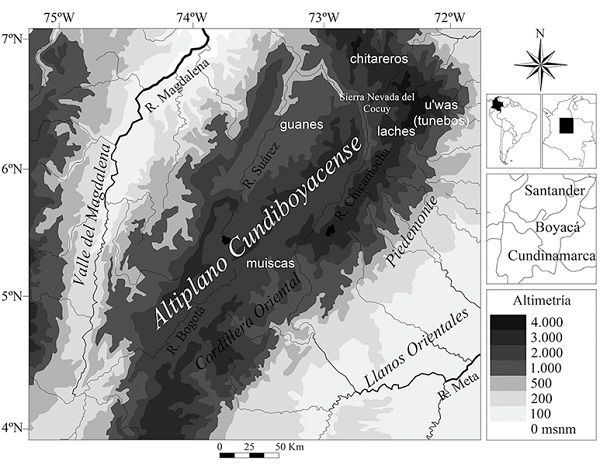 En el presente artículo se analizarán algunos elementos de la conformación de un espacio en disputa, el Altiplano Cundiboyacense en la segunda mitad del siglo XVI. Al finalizar la década de 1530, esta región estaba ocupada por un conjunto de cacicazgos agrupados bajo la denominación étnica de muiscas,2 y fue donde se ubicó durante todo el período hispánico el epicentro político del Nuevo Reino de Granada. El siguiente escrito presentará un análisis construido con la lectura e interpretación de datos arqueológicos e historiográficos disponibles para la región. Se encamina a cuestionar cómo pudieron haber asumido los muiscas su territorialidad antes de la conquista española, a entender cómo impulsaron los españoles el ordenamiento del Altiplano Cundiboyacense y a explicar cómo el espacio fue un elemento de confrontación interétnica entre las sociedades indígenas y española.