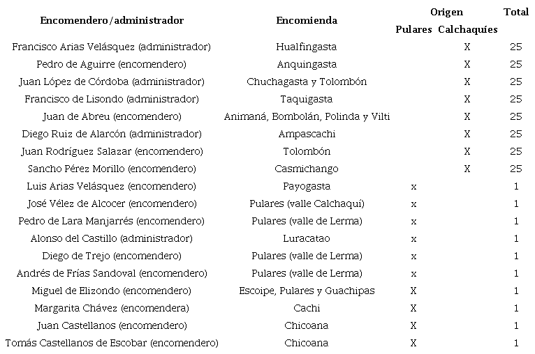 Como se observa en la Tabla 1, cada encomendero o administrador debía aportar a la mita en el mes requerido veinticinco indígenas en caso de los calchaquíes, o uno sólo en el caso de los pulares, en turnos rotativos de cinco meses, que se sumarían a los ocho calchaquíes ya asignados por el cabildo antes de mayo de 1655, y hasta “que se acabe de hacer y edificar el Ingenio de agua de moler metales que están haciendo en el dicho Ingenio”.9