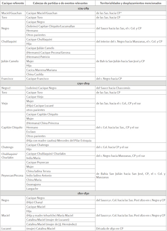 En segundo lugar, hubo una mayor integración territorial y comercial entre estos cacicatos, que posiblemente también implicó la extensión del parentesco. Capitán Chiquito, Princesa y sus parientes intermediaron en los desplazamientos de partidas entre el Colorado y el sur del río Negro de forma consistente. Estos acompañaron partidas del sur en regreso a sus toldos, y Princesa pasó a Patagones para dirigirse al sur y ubicar sus toldos junto a los de Peynecán en 1798.50 Aunque se suele referir al sur sin demarcar con exactitud la locación, la información y los caciques nombrados muestran la continuidad de un fluido recorrido entre el estrecho de Magallanes y el río Negro. Un hermano de Chiquito también vino del sur a incorporase a su familia en Patagones. En varias ocasiones vinieron acompañados por el cacique Viejo y su hijo Lucanei, quienes también se acercaron con otros, como Chapingo y Peynecán, y se enviaban avisos y mensaje.51