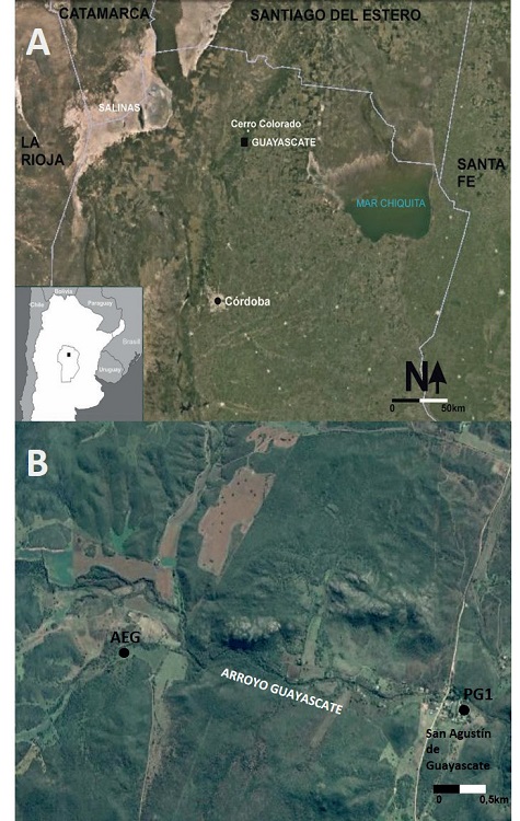 No obstante, son escasos aún los trabajos arqueológicos orientados a comprender las estrategias de las comunidades prehispánicas frente a la imposición española (Laguens, 1999; Bonofiglio, 2013; Pastor y Medina, 2013; Recalde y González, Navarro 2014), principalmente porque no se han identificado sitios en la región serrana que presenten evidencias claras del nuevo contexto social generado por la conquista. Cabe mencionar que en los últimos años se han desarrollado importantes avances en este tema en el denominado “centro histórico” de la ciudad de Córdoba, fundada en 1573 (Berberián et al., 2008; Lindskoug et al., 2011; Izeta et al., 2012, 2014; Martínez de Sánchez, 2013; Bettolli, 2014; González Navarro y Marschoff, 2019; Marschoff y Lindskoug, 2020), pero la contextualización de esos sitios es diferente al proceso que tuvo la ocupación hispana en el área rural, la cual generó problemáticas diferentes (Bonofiglio, 1999, 2013; González Navarro, 1999, 2009; Castro Olañeta, 2006; Tell y Castro Olañeta, 2011; González Navarro y Grana, 2014; Borrastero, 2021). En este contexto, el paraje Guayascate (Depto. Tulumba, norte de la prov. de Córdoba) constituye un área importante para comenzar a vislumbrar desde las evidencias materiales los cambios y continuidades en las estrategias sociales ocurridas entre las comunidades locales a partir de la instauración del sistema colonial.