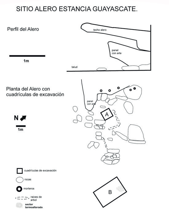 Las excavaciones arqueológicas en el interior del alero y en el talud señalan prácticas realizadas por un número reducido de individuos, vinculadas a la producción y consumo de alimentos (López, 2021). Hasta el momento, solo se ha identificado un nivel de ocupación a los 20 y 25 cm de profundidad dentro del alero y en su talud, respectivamente. En el primer caso se tocó roca madre y en el segundo se llegó a sedimento estéril arqueológicamente. El material recuperado presenta afinidad principalmente con el Período Prehispánico Tardío (López, 2021). Este consta de fragmentos cerámicos, correspondientes en su mayoría a cuerpos de tres modos tecnológicos -alisado, pulido y moldeado sobre cesta-, predominando las de superficies alisadas y sin decoración (70 %), artefactos líticos -punta de proyectil triangular apedunculada, desechos de cuarzo y sílice- y restos arqueofaunísticos de mamíferos grandes y pequeños, destacándose camélidos (Lama sp.), vizcachas (Lagostomus maximus) y posible mara (cf. Dolichotis patagonica), muchos termoalterados. Asimismo, se registraron fragmentos de cáscara de huevo de Rhea sp.