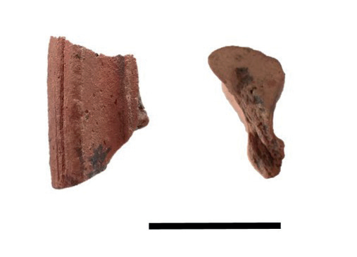Dentro del conjunto cerámico dos tiestos identificados como bordes llaman la atención. Uno presenta decoración semejante a los de diseño Bislín inciso descripto para la zona media del río Salado (Santiago del Estero), ubicado cronológicamente por Taboada en 950 ± 90 AP (Lorandi, 1977; Taboada, 2019). El otro muestra, por sus características, una producción indígena pero con morfología que no concuerda con la detallada en la bibliografía referenciada para momentos prehispánicos (Fig. 4). El análisis preliminar permitió identificar rasgos que indican el uso del torno, como son las estrías paralelas en la superficie interna y externa (cfr. Roux y Courty, 1998), los cuales se vinculan al Período Colonial Temprano.1