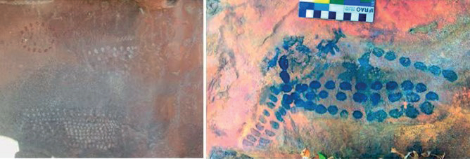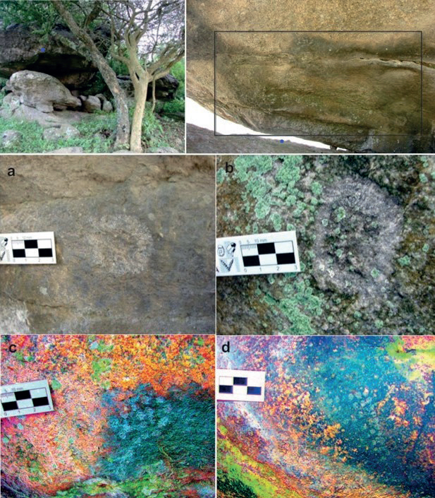 En el interior del alero se documentaron cuatro motivos geométricos blancos distribuidos en un panel de 37,1 cm de largo por 30 cm de alto (Fig. 5). Podemos identificar las representaciones, en función de la tipología definida para Cerro Colorado (Recalde, 2015, 2018), como expresiones de tres subtipos: dos círculos, uno de los cuales presenta un apéndice (Fig. 5 a y b), un triangular ejecutado y un cuadrangular, ambos realizados mediante el uso de puntos (Fig. 5. c y d). El estado de conservación es bueno, a excepción del último motivo, que se encuentra en la línea de goteo y esto ha afectado la visibilidad de algunos puntos que integran la figura (Fig. 5 c). Con excepción de los elementos que la componen no se detectaron diferencias tonales considerables, o eventos de mantenido o repintado que permitan proponer una secuencia relativa de ejecución.
