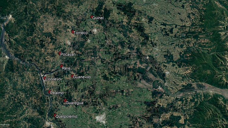 En el fuerte de Buena Esperanza donde la estancia de Su Majestad situado en el valle de Guelquillemo […] hizo parecer ante si los caciques principales de las provincias de los indios Cuyuncheres […] de la segunda regua llamada Pocoyan los caciques Tanaante, Turrevaute, Cheuquimolio, Callbuala y de la tercera regua llamada Tomeco los caciques Millaquien, Collpillan, Antipolay, Taemlevo […] de la sesta regua llamada Conilevo los caciques Longomilla, Guacaya.33