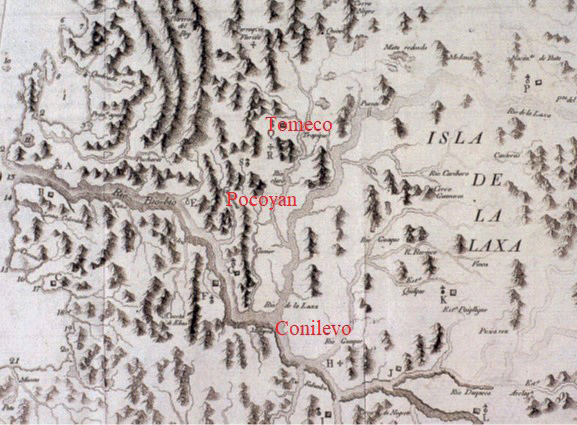 […] el repartimiento que el dicho tuvo por encomendar en términos de la ciudad Juan Caro en esta forma setenta indios de visitación en el levo de Conilevo en los caciques Nesleeponabal, Coyachine, Lipiguala, Vanoraque, Andepanque, Tanan23