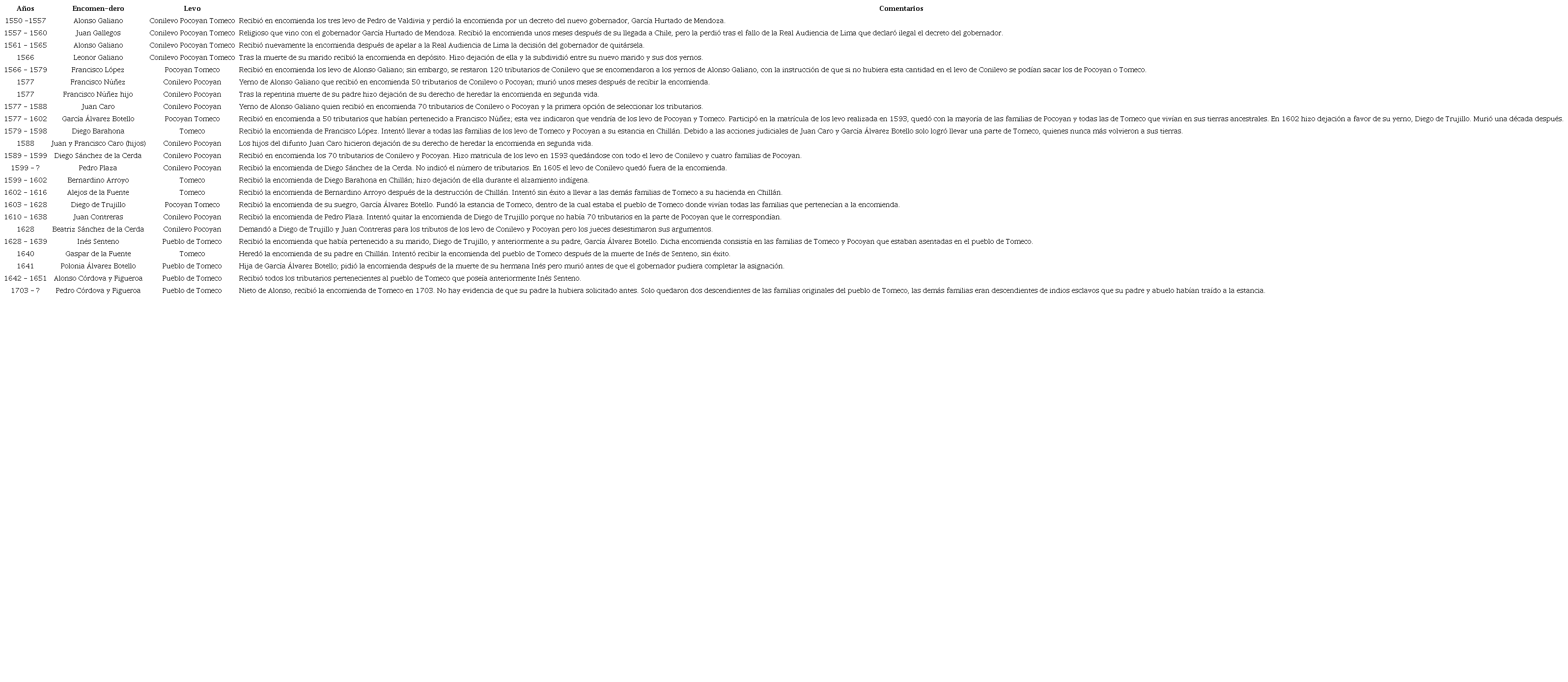 En otras palabras, Juan Caro obtenía derecho sobre 70 tributarios del levo de Conilevo, descontados estos 70 correspondía la entrega de otros 50 a Francisco Núñez. Si por diversas razones no se alcanzaba esa cifra con los tributarios de Conilevo se podía completar con los tributarios de los levo de Pocoyan y Tomeco, también pertenecientes a la encomienda de Galiano transferida al segundo esposo de su viuda -Francisco López. Al momento de la entrega de los tributarios a Juan Caro y Francisco Núñez no se había hecho una nueva matrícula, por lo cual no se sabía con exactitud el número real de tributarios disponibles entre los tres levo de la encomienda Galiano/López.