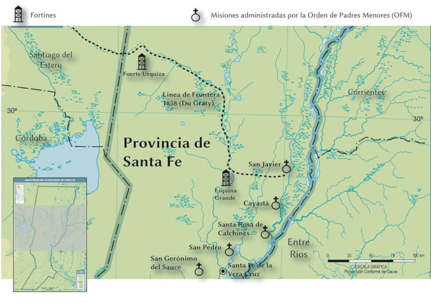 Los trabajos producidos por Manuel Cervera (1907) y Bernardo Alemán (1970, 1994), se interesaron por elaborar una historia de las instituciones de la provincia de Santa Fe, su organización territorial y ordenamiento político desde el periodo colonial hasta los inicios del siglo XX. Dentro de estos temas se indican con particular importancia la administración militar y eclesiástica de las fronteras y la fundación de nuevos fuertes, fortines y reducciones. En el marco de esta historia la presencia de los pueblos indígenas ha sido un tema recurrente, principalmente los aspectos relacionados con su clasificación etnológica, distribución geográfica, relaciones con administradores coloniales, misioneros, etc. Estas aproximaciones han contribuido al conocimiento de las poblaciones indígenas y sus principales intervenciones en la historia santafesina. No obstante, la mayor parte de estas estuvieron asociadas a acciones bélicas, saqueos de pueblos y destacamentos militares o misiones, o conflictos de diferentes tipos. Rara vez estas producciones han desplazado a los pueblos mocovíes, abipones y tobas de connotaciones negativas. Así lo expresan los primeros párrafos de un conocido trabajo de Alemán: