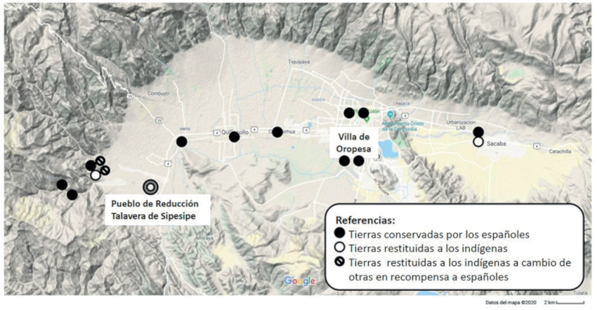 Los objetivos centrales de reconfiguración del territorio impulsados durante la visita general primaron al momento de producirse el arbitraje en las disputas entre indígenas y españoles por las tierras de Cochabamba. Si bien Núñez Bazán entendió que los reclamos del repartimiento de Sipesipe eran legítimos y que se había logrado dar prueba suficiente de sus derechos, no le otorgó la posesión de la mayoría de las tierras litigadas. No podía hacerlo. Eso hubiera generado un desequilibrio del orden social establecido. Y además, habría significado ir en contra de la territorialidad toledana proyectada en los valles. Por un lado, porque la concesión al repartimiento de Sipesipe de terrenos en diferentes partes de Cochabamba hubiera favorecido el mantenimiento de pautas de asentamiento disperso que la política reduccional pretendía eliminar. Por el otro, porque la adjudicación de tierras a los españoles era una manera de patrocinar el poblamiento en torno a la recientemente fundada Villa de Oropesa.