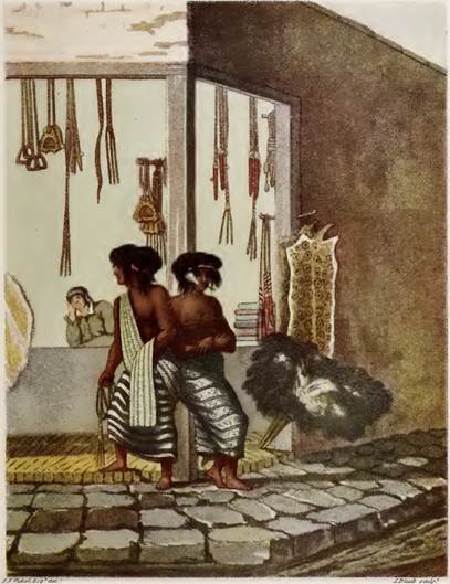 Por aquellos años, el comercio indígena ocupaba un lugar relevante en Buenos Aires, tanto en términos geográficos como mercantiles. El marino británico Emeric Essex Vidal, quien estuvo en el Río de la Plata entre 1816 y 1818, publicó a su regreso a Gran Bretaña un pequeño volumen con ilustraciones comentadas sobre Buenos Aires y Montevideo. En una de sus acuarelas, se ve a dos “indios pampas” apoyados en la puerta de un negocio en el que se exhiben tejidos, pieles, riendas, estribos y plumeros, típicas manufacturas indígenas pampeanas. De acuerdo a su explicación, se trataba del “mercado indio” de Buenos Aires, ubicado en la intersección de las Calle de las Torres y el Camino de las Tunas,33 punto neurálgico de acceso a la ciudad desde el sur y desde el oeste; en él los negocios compraban al por mayor las mercaderías indígenas y las vendían al por menor a los vecinos de la ciudad y campaña (Vidal, [1820] 1944: 55).