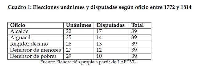 De esta forma, las elecciones en este cabildo se muestran como mayoritariamente unánimes, aunque no totalmente. En este sentido es interesante marcar que, a pesar de la mayoría de elecciones unánimes en cada oficio, en solo 13 de las 39 ocasiones la totalidad del cabildo entrante fue nombrado de este modo. Es decir, en varios años existió una disputa por los oficios que no pudo ser consensuada por los cabildantes en ejercicio. En ciertos contextos el entredicho se expresó en un conflicto abierto. Los siguientes ejemplos nos permitirán apreciar algunas prácticas electorales desarrolladas en aquellos tiempos.