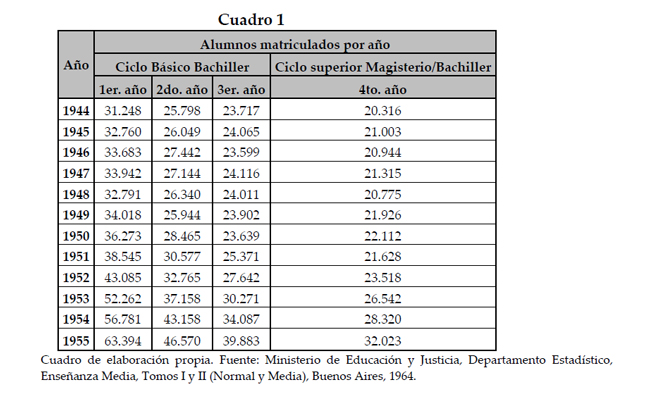 La información de este cuadro, demuestra que el aumento matricular experimentado en la educación media durante el peronismo no se produjo en forma homogénea. Por lo contrario, se visualiza que acorde al avance en el trayecto formativo de cada una de las cohortes, los números de inscripciones se reducen marcadamente. Para el caso, sí se toma la cantidad de alumnos que ingresaron al primer año de Ciclo Básico Bachiller entre el período 1946-1952, y se la compara con la cantidad de los alumnos de esas mismas cohortes que lograron acceder al primer año del Ciclo Superior Bachiller y Normal, resulta claro que el índice promedio de desgranamientos asciende a un 30,52%.