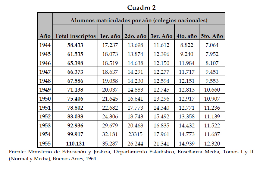 En este contexto, cabe destacar que la información aquí expuesta no pone en juego la veracidad de las investigaciones que sostienen que durante los años del primer peronismo, en las escuelas Bachilleres y Normales, se produjo un crecimiento absoluto en la tasa anual de inscripciones equivalente al 5,9% y 6,8% respectivamente. Empero pone en relevancia la necesidad de evaluar estos números en términos relativos. De esta forma resulta posible identificar que mientras la matrícula de ingresantes al primer año experimentó un crecimiento promedio anual del 4,07%, la misma disminuyó notoriamente en el camino hacia el Segundo Ciclo.