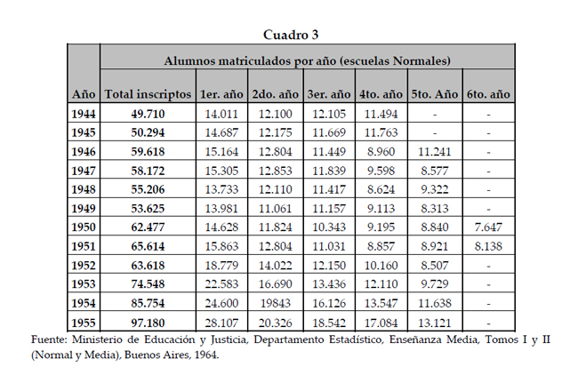 Cuando se analiza en forma individualizada la situación matricular de las carreras de formación docente y bachillerato, es posible identificar que el desgranamiento experimentado entre el último año del Ciclo Básico y el primero del Ciclo Superior es ampliamente pronunciado en las escuelas Normales. Mientras que en el Cuadro 2 se observa que entre 1946 y 1952 las inscripciones para cuarto año de los colegios nacionales experimentaron un aumento anual promedio del 5,84%, el Cuadro 3 indica que en los establecimientos donde se formaban los futuros maestros la matriculación se redujo un 1,32%. Es por ello que, frente a esta notoria diferencia, resulta necesario indagar cuáles fueron los motivos por los que, durante este período, una de las carreras con mayor índice de matriculación histórico acabó por reducir su número de inscripciones.[28]