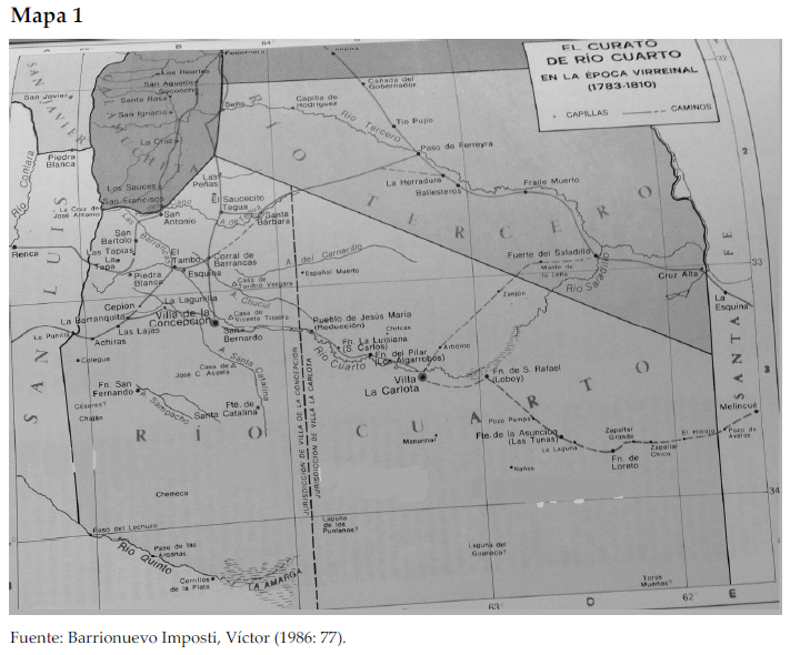Según el planteo de María Rosa Carbonari los primeros españoles en arribar a la región del río Cuarto, límite entre las sierras y el llano, lo hicieron en el mismo año de la fundación de la ciudad de Córdoba en 1573 (Carbonari, 2011: 23-43). Las tierras pasaron a pertenecer a los descendientes del fundador Jerónimo Luis de Cabrera y a comienzos del siglo XVIII uno de los herederos fraccionó la propiedad. Esta parcelación posibilitó el arribo de nuevos pobladores que se agruparon alrededor de la antigua capilla del casco de una de las estancias donde posteriormente se localizó el fuerte de la Concepción a cargo del comandante Juan Agustín de Balmaceda y que más tarde adquirió el rango de villa (Barrionuevo Imposti, 1986: 51-71).