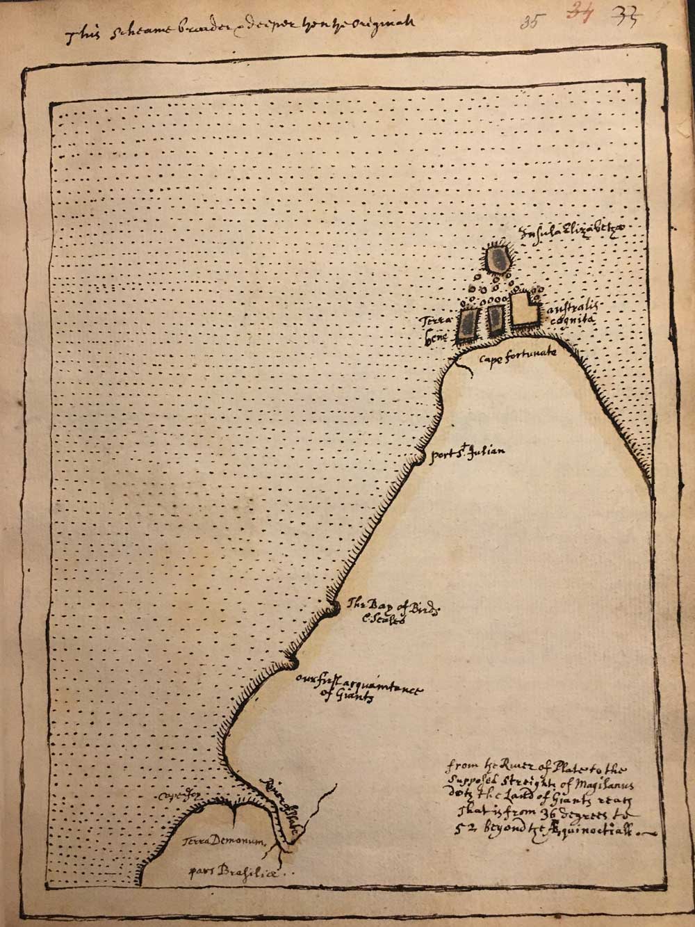 Mapa del extremo sur de la Patagonia. Copia de John Conyers (1677) del manuscrito original de Francis Fletcher (British Library, Sloane MS 61, fol. 35r.).