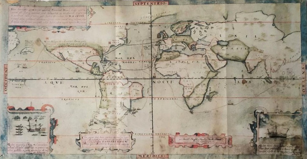 Vera descriptio expeditionis nauticae Francisci Draci Angli… Mapa manuscrito del viaje de circunnavegación de Francis Drake (c. 1587).