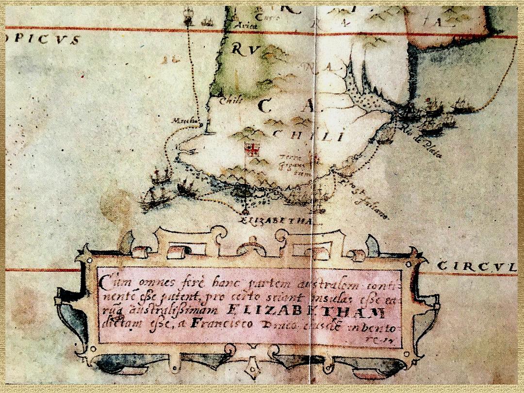 Bien sabido es que la proposición de nombres para los territorios desconocidos son dispositivos de dominación, en la medida en que señalan la impronta de sus descubridores, tanto por el uso de nombres propios como, indirectamente, por la lengua de origen de quienes lo proponen. Una importante serie cartográfica se hizo eco de la porción más austral del continente, a la que involuntariamente llegó Drake por un fuerte temporal una vez que atravesó el Estrecho. De los tres barcos de la compañía que lograron llegar al Pacífico, uno desapareció (el Marigold) y el otro (el Elizabeth) logró volver por el mismo canal rumbo a Inglaterra. El Golden Hind (nuevo nombre otorgado al Pellican, una vez superado el cruce), con cerca de ochenta hombres, fue arrastrado hasta el sur de Tierra del Fuego, lo que convirtió a Drake en el “descubridor de la insularidad fueguina” (Martinic, 1998), rompiendo así con la larga tradición que consideraba a la mencionada isla como la península de un inmenso territorio austral: la Tierra Austral Incógnita.[37]