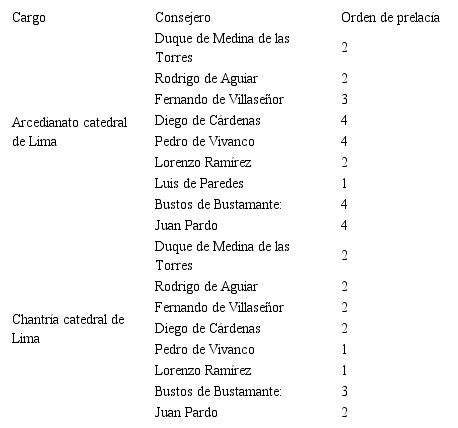 Las diferencias entre una y otra consulta están referidas a: 1) para la chantría el licenciado Luis de Paredes no dio su voto a Vega y Padilla; 2) para el arcedianato, la mayor parte de consejeros votaron en tercer y cuarto lugar a Vega y Padilla, contrario al orden de prelacía dado en la chantría, cargo en el que fue finalmente nombrado por el rey; y 3) salvo tres consejeros, en ninguna de las dos consultas fue propuesto de manera unánime en primer lugar. Varias hipótesis pueden explicar esta situación. Una radica en algunos conflictos que tuvo Vega y Padilla en el cabildo catedral de Lima y su evidente apego a la Universidad (Gálvez Peña, 2012: 108), con lo cual se generó una rencilla evidente entre ambas instituciones; también es de considerar que Vega y Padilla fungía como provisor del arzobispo Arias de Ugarte, por lo que el nombramiento como arcediano podía generar una concentración de poder, dadas las obligaciones y gestiones propias de este cargo en los cabildos eclesiásticos. Además, las actuaciones en lima del clérigo limeño no pasaron desapercibidas para el rey Felipe IV, quien en cédula real el 10 de julio de 1623 ordenó al arzobispo de Lima Gonzalo López de Ocampo, a tomar residencia al cargo de provisor y vicario general que ostentaba Vega y Padilla desde 1610, en tanto en ese tiempo “ha cometido y comete en el ejercicio de su oficio muchos excesos en perjuicio de las partes” (Eguiguren, 1940: 765); si bien el resultado del juicio de residencia salió a favor de Vega y Padilla, no sobra advertir el llamado de atención del rey.