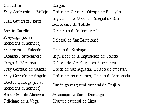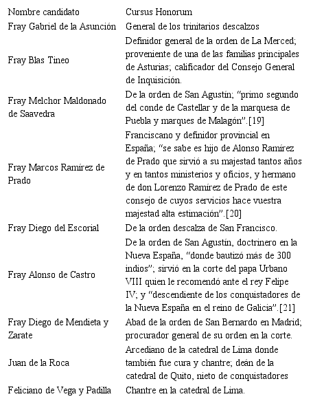 Ahora bien, un ejemplo de la incidencia del perfil de un candidato en el Consejo de Indias se presenta en el caso de la carrera eclesiástica del prelado limeño, quien en la primera mitad del siglo XVII logró como enuncié anteriormente, dos promociones en el cabildo catedral de Lima y en episcopados de las Indias Meridionales hasta ser nombrado arzobispo de la ciudad de México, siendo el primer y único eclesiástico de origen peruano en recibir dicho nombramiento. Daré cuenta a continuación de su candidatura en diversas consultas, y la importancia que fue tomando entre los consejeros de Indias.