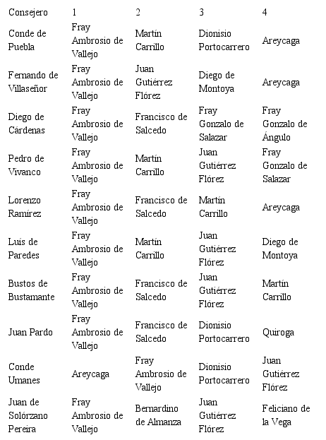 Queda claro que la mayor parte de los consejeros votaron para que la terna quedara encabezada de manera unánime por fray Ambrosio de Vallejo, quien fue finalmente nombrado para dicho cargo por el rey. Es importante resaltar que el único consejero que votó por Vega y Padilla fue Juan de Solorzano Pereira. La siguiente consulta para una vacancia episcopal indiana se presentó el 19 de julio de 1630, esta vez para elegir al sucesor de fray Ambrosio de Vallejo en el obispado de Popayán,[18] en la que se consideraron nueve candidatos: