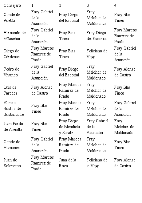 Dos años después, el 17 de agosto de 1632 se realizó una nueva consulta para el obispado de La Paz, dado que el obispo de dicho episcopado, el doctor Pedro de Valencia por su vejez y perdida de la vista, no podía realizar el oficio pastoral;[22] la votación se presenta a continuación: