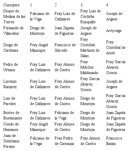 No quiero dejar de advertir que en la revisión del testamento del arzobispo, realizado en La Paz el 4 de febrero de 1639, se hizo presente el envío de mil ducados de once reales al licenciado José González, consejero de la Cámara de Castilla, para que dispusiera de ellos según le había comunicado en varias cartas enviadas tiempos atrás (Eguiguren, 1940: 830). González se encontraba emparentado con Vega y Padilla, por ser tío de Atanasio Jiménez de Arellano, esposo de su sobrina Feliciana de Vega,[33] pero, además, tuvo un protagonismo vital en el espacio cortesano en Madrid. Denominado como la “eminencia gris”, fue uno de los favoritos del conde-duque de Olivares, con un destacado cursus honorum[34] y amigo de Solorzano Pereira, a quien le brindó licencia en 1629 para la impresión del De Indiarum Iure (García Hernán, 2007: 217). Su nombramiento el 10 de octubre de 1629 como consejero de Castilla es destacado en tanto este consejo fue una de las instituciones más importantes en la definición de la política y decisiones de Estado de la monarquía hispánica (Fayard, 1982: 161 y 508), situación que aprovechó el conde-duque de Olivares, para situar en él a sus favoritos, entre los que se cuentan el licenciado González quien como explica Elliot fue parte de su clientela y de más absoluta confianza. Con este nexo es posible ubicar a Vega y Padilla en un círculo muy cercano del poder y la política clientelar del valido de Felipe IV,[35] proximidad que probablemente jugó un papel fundamental en los nombramientos a cargos episcopales en los que fue nombrado el clérigo limeño. Con esto quiero advertir, que la posible incidencia del perfil de Vega y Padilla en los consejeros estuvo dada por sus vínculos con la clientela cortesana del conde-duque de Olivares.