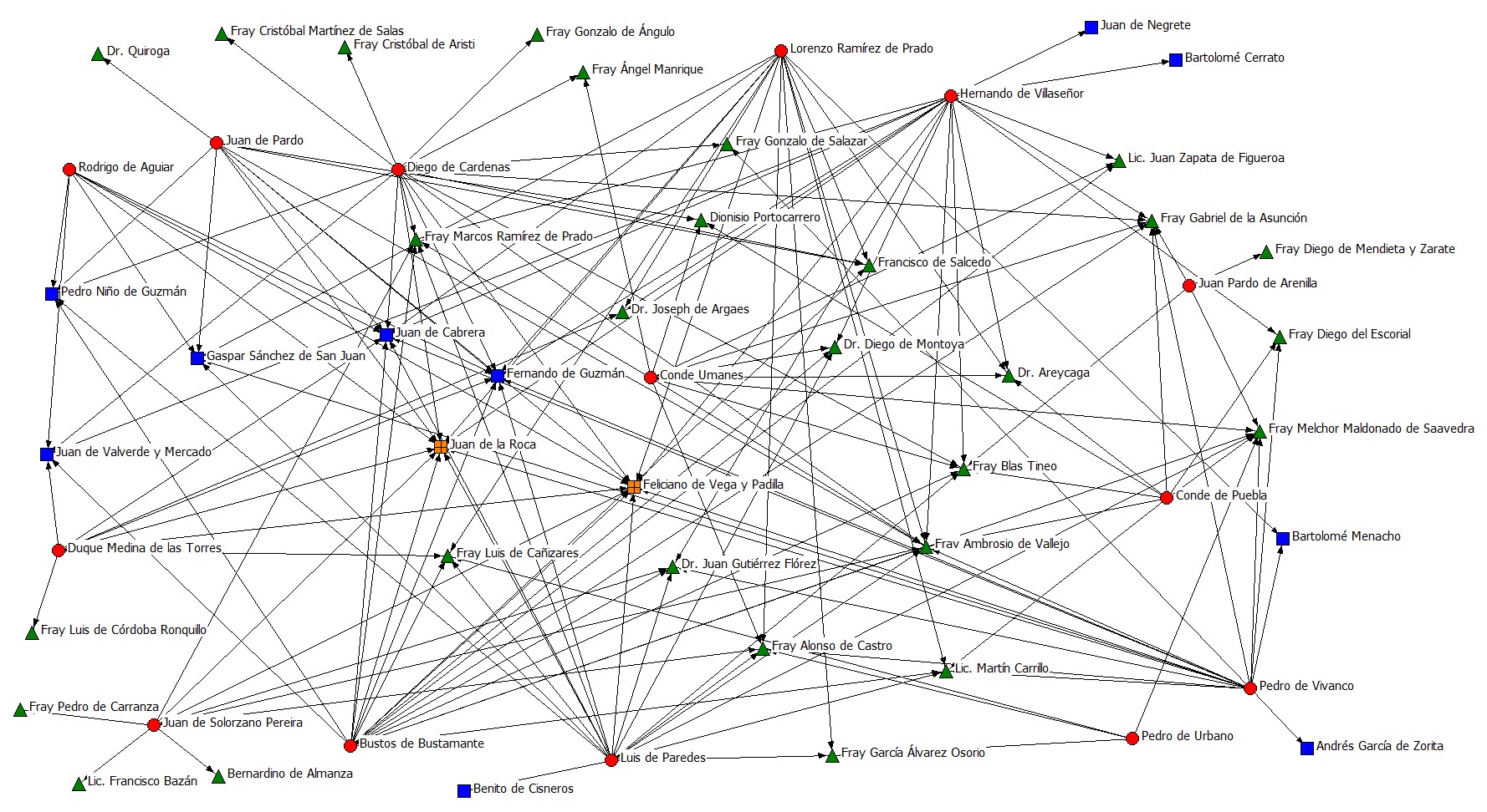 Los nodos rojos corresponden a los consejeros de Indias, los nodos azules a los candidatos eclesiásticos a prebendas, y los nodos azules, a los candidatos a episcopados. De este sistema relacional, resaltan los dos nodos naranjas que corresponden en la esfera de eclesiásticos consultados a prebendas y episcopados, a los candidatos Juan de la Roca y Feliciano de Vega y Padilla. Revela este grafo la complejidad de las votaciones presentes en el Consejo de Indias, pero a la vez va exponiendo el capital relacional con el que cuenta el limeño en el seno del Consejo, en comparación con otros candidatos.