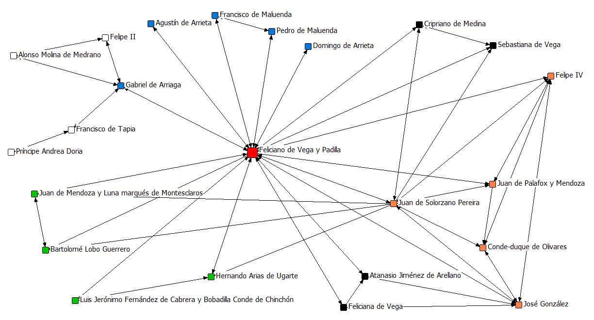 Destacan primero sus procuradores en Madrid (nodos azules) entre quienes resalta Gabriel de Arriaga por su posición en la Casa del Rey y en la Corte, así como sus vínculos. En segundo orden, la autoridad episcopal y virreinal limeña (nodos verdes), quienes al ser agentes de la monarquía estuvieron en cartas y recomendaciones insistiendo en la necesidad de que Vega y Padilla fuera nombrado en cargos de mayor prestancia. Siguen los vínculos familiares (nodos negros) que fueron una de las vías con las que aseguró su amistad y cercanía con integrantes de los consejos en Madrid. Por último, en nodos naranjas aparece su clientela en Corte, que a la vez es parte del grupo de poder liderado por el conde-duque de Olivares.