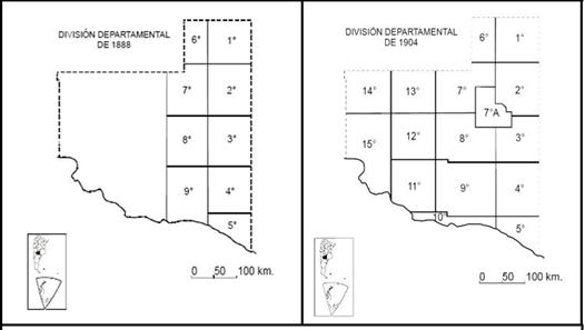 En este marco, se creó el TNLP junto con otras ocho entidades administrativas equivalentes en 1884 –destacadas con colores en el Mapa 1–.[5] Este espacio posee la particularidad de contar en su zona noreste con características agronómicas aptas para las exigencias productivas del modelo agroexportador (Araoz, 1991). Situado en una “encrucijada regional”[6], el TNLP estuvo signado por ser una sociedad de frontera, en términos económicos, poblacionales y productivos. Las tareas de mensura destinadas a incorporar efectivamente las tierras al aparato productivo se iniciaron en 1882 según la ley 947. Esta acción fue clave para la posterior delimitación de los territorios nacionales (en adelante TN). La mensura estableció una cuadrícula apoyada en los cuatro puntos cardinales. En su interior se definieron secciones (de 100 km x 100 km), fracciones (de 50 km x 50 km), lotes (de 10 km x 10 km) y leguas (de 5 x 5 km). Bajo este sistema se gestionaron catorce millones y medio de hectáreas. Los trabajos finalizaron en 1888 cuando se promulgó la mensura y se establecieron los nueve departamentos iniciales sobre la zona más productiva del territorio en términos agropecuarios (ver Mapa 2). De este modo, se incorporaría una basta cantidad de tierra con condiciones para lograr la inserción argentina al mercado internacional.