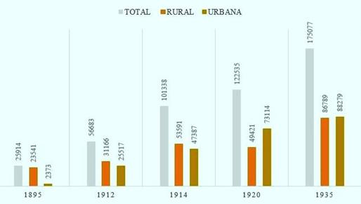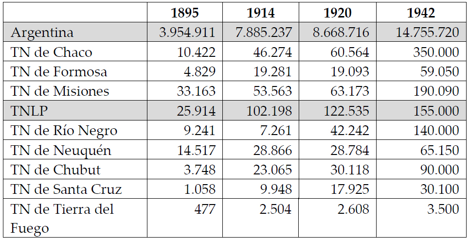 La característica más sobresaliente de los TN en el paso del siglo XIX al XX fue un marcado “dinamismo poblacional” (Torrado: 2008, 15-16). Si tomamos como referencia los indicadores presentados por Ander Egg (1957) la tendencia al crecimiento demográfico fue continuo hasta inicios de los años treinta. Con una superficie total de 142.718 km2 el TNLP contó con una población predominantemente rural, en detrimento de los centros urbanos. Estos se desarrollaron desde inicios de siglo XX, a partir de la fundación de localidades, y por lo menos hasta los años veinte (ver Gráfico 1).