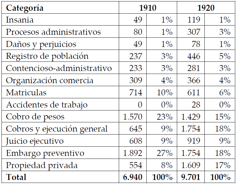 Producto de este estudio, pudimos corroborar que la institucionalización de la justicia acompañó al crecimiento poblacional, a su complejización, pero también a un marcado ritmo de demandas sociales frente a estas instituciones estatales. En otras palabras, el recurso a las instituciones estatales existió y requirió progresivamente de un robustecimiento capaz de atender al funcionamiento diario de la justicia. La selección de los procesos implicó reconocer que los JLN no fueron la opción más próxima, sino la que ofrecía un menú más variado para la reposición de derechos o la resolución de conflictos, sobre todo en materia económica. Una abrumadora mayoría de los expedientes se vinculan con cobros, en sus distintas variantes tal como indicamos en la Tabla 2. Ahora bien, además de las cuestiones económicas y productivas, el fuero conserva en su interior vetas de trabajo futuro aún no exploradas, en torno a la organización de la sociedad, los vínculos intrafamiliares o interpersonales; y también causas que permiten conocer quejas o recursos interpuestos contra las instituciones estatales, por solo mencionar algunos ejemplos entre los posibles.