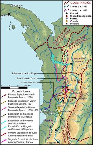Y, aunque, desde la década de 1570 hubo intentos serios por dominar el Chocó (se fundaron ciudades como Toro y Cáceres), su geografía accidentada y la resistencia decida de los indios que lo habitaban, hicieron que la mayoría de las campañas lanzadas por los españoles fracasaran. Sin embargo, el interés por conquistar a los nativos no desapareció, principalmente, porque habitaban una zona que albergaba ricos yacimientos auríferos. Por esta razón, en 1626 el obispo de Popayán fray Ambrosio de Vallejo escribió un contundente informe a Felipe IV en el que aseguraba que toda su diócesis se encontraba en “estado miserable” y que si no se abría un camino a las minas de Toro El viejo para que se “buelban a poblar y asegurar de la gente de guerra de aquellas montañas que la ay hasta la mar del Sur”, era muy probable que todo el sistema económico de esa región colapsara. Y sentenciaba el prelado que, “suele perder la guerra quien conserva la paz”, en una clara alusión a que debía emprenderse campañas militares hacia las zonas donde aún habitaban nativos que no habían sido dominados por los españoles.[3]