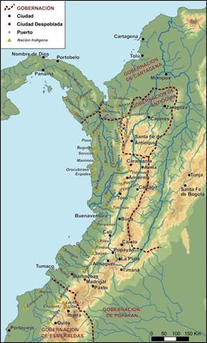 A pesar de esa riqueza, las elites españolas nunca pudieron acumular el suficiente capital como para generar una estabilidad económica parecida a la peruana o novohispana. Los ciclos cortos de producción aurífera provocaron el constante interés de las autoridades reales por ampliar la frontera minera. Esta política, ocasionó que el Nuevo Reino viviera de manera prolongada, un período de guerras contra los indios que habitaban las zonas no dominadas. Este fue el caso de las provincias del Chocó. Si bien este territorio fue el primero en ser explorado por los europeos tras la fundación de la ciudad de Santa María la Antigua del Darién (1510), ya para la segunda mitad del siglo XVI, el Chocó empezaba a definirse como una región periférica de la Monarquía Hispánica.