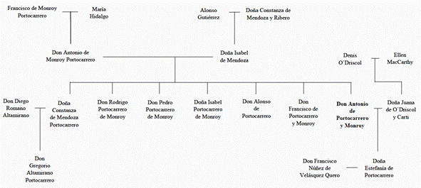 Ante el fracaso de la política belicista, el gobernador Vélez de Guevara y Salamanca fue reemplazado por don Antonio de Portocarrero y Monroy (1642-1646), un limeño que había servido al rey en diferentes regiones de la Monarquía Hispánica.[25] Don Antonio estaba ligado a la familia de los condes de Medellín y Deleytosa y de los señores de Belvís.[26] Su hermana, doña Constanza de Mendoza, casó con don Diego Romano Altamirano; mientras que sus hermanos, sirvieron al rey en diferentes lugares de la Monarquía: don Alonso y don Francisco estuvieron destacados en Milán; mientras que don Pedro, fue caballero del hábito de Santiago (Lohmann Villena, 1947: T. I, 389).[27] Debe recordarse que, una característica de los linajes que tenían presencia en diferentes territorios de la Monarquía Hispánica, era su versatilidad para alcanzar la promoción social tan anhelada. Para lograr su objetivo, estas familias ejercían una política de conveniencia y de captaciones de recursos, oficios o privilegios (Yun Casalilla, 2019: 233).