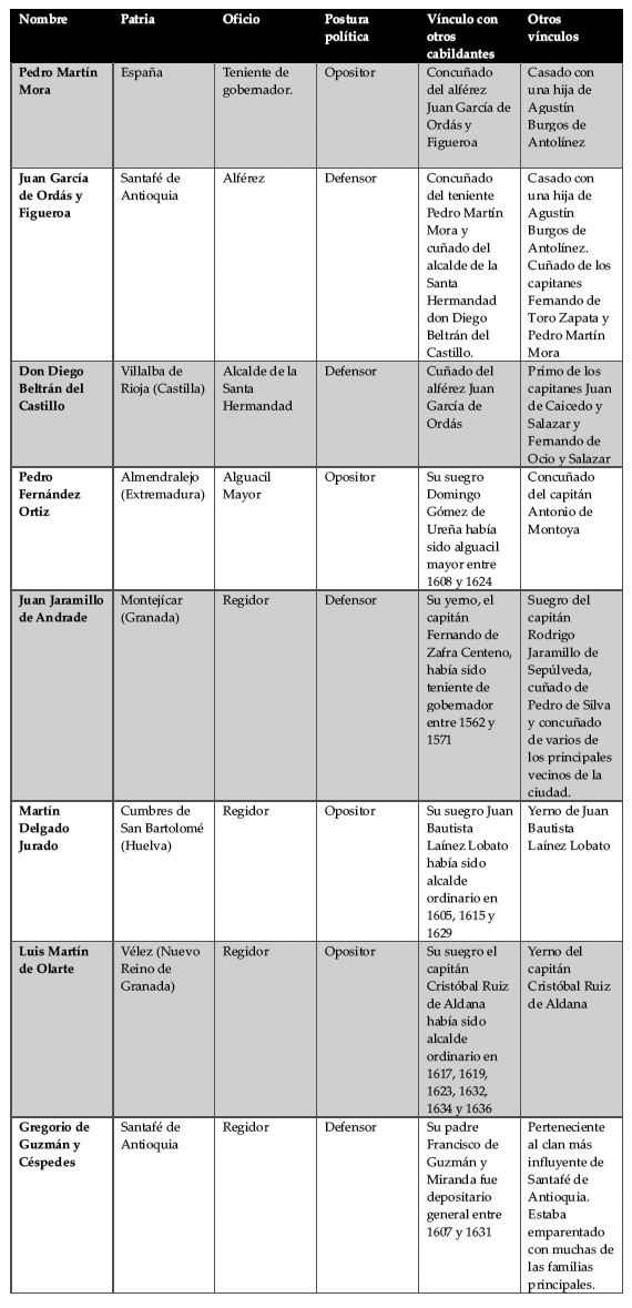 Quizá, este cambio se debía a la creciente criollización del cabildo de la población. Varios de sus miembros eran naturales de esta región o si eran españoles peninsulares, estaban emparentados con las familias que llevaban varias décadas asentadas allí. Por ejemplo, el ayuntamiento de 1643 estaba compuesto por seis españoles peninsulares y tres criollos.[35] Se trataba del teniente general de la ciudad, el capitán Pedro Martín Mora, el alférez Juan García de Ordás y Figueroa, el alcalde de la Santa Hermandad don Diego Beltrán del Castillo (quienes conformaban el grupo de principales mineros de la ciudad y estaban emparentados con los capitanes Fernando de Toro Zapata, Esteban de Rivera, Agustín Burgos de Antolínez y Fernando de Ocio y Salazar).[36] Seguidamente, se encontraba el alguacil mayor Pedro Fernández Ortiz, un extremeño reciente emigrado a la provincia de Antioquia y los regidores Martín Delgado Jurado, Luis Martín de Olarte,[37] Juan Jaramillo de Andrade y Gregorio de Guzmán y Céspedes (estos dos últimos pertenecientes a las familias más encumbradas de la región y con una larga presencia en los intentos de conquista de los indios del Chocó) (Jaramillo Mejía, 1996: T. II, 459-539).[38]