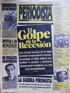 Al mes siguiente, la profundización de la crisis, con el aumento abrupto de las tasas de interés, sería editorializada desde la portada como “golpe de la recesión”.[6] Esta forma de denominar la acción mercantil evocaba el golpe de Estado de 1976 y fue definida como un desafío al gobierno por intentar su “desestabilización” (sic) en favor de los intereses concentrados.