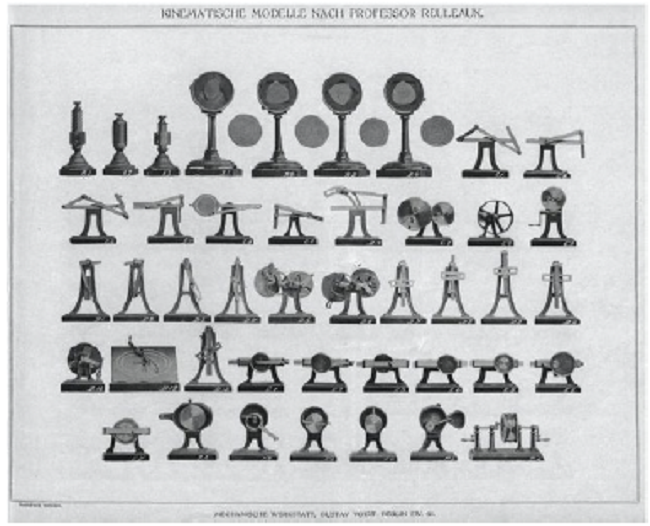 Esta consideración fue profundizada por otro ingeniero formado en matemáticas, Franz Reuleaux. En su Theoretische Kinematik, publicada en 1875, Reuleaux añadió una serie de fundamentos matemáticos y topológicos, que por primera vez fueron aplicados a la ingeniería39, con los que aisló, en buena medida, los principios geométricos de los "mecanismos puros" de Willis. La idea de que el diseño de cada máquina descansa sobre la combinación de ciertas formas finitas y susceptibles de ser clasificadas y caracterizadas, llevó a Reuleaux a elaborar un inventario de los mecanismos existentes para construirlos.