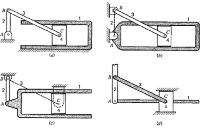 Desde este punto de vista y dada una clase de máquina podemos inferir la combinación de mecanismos que hace posible su existencia pero, dada una determinada combinación de mecanismos no se puede determinar fehacientemente la función externa que tendrá la máquina. Si bien las máquinas tienen un origen humano y una finalidad práctica, la posibilidad de su existencia radica en el comportamiento de ciertas organizaciones materiales que no están determinadas por la intencionalidad humana sino por principios matemáticos, y que son susceptibles de ser investigados en sí mismos. Por otra parte, la clasificación de los mecanismos se establece por la organización de sus elementos y la fijación de uno de ellos como punto de referencia. La fijación de ese elemento constituye lo que Reuleaux llama inversión cinemática: el mismo tipo de mecanismo puede dar lugar a varios tipos de comportamiento, de lo que se sigue que el mismo mecanismo puede ser condición de posibilidad de varios tipos de máquinas, según en qué eslabón se aplique una fuerza. Expliquemos este punto con mayor detalle a partir de un ejemplo. Como se puede ver en la figura 6, el mismo mecanismo, conocido como corredera-manivela, puede dar lugar a cuatro inversiones cinemáticas distintas, según el eslabón en el cual se fije. En la ilustración b (figura 6), por ejemplo, el bloque 1 gira en torno a la revoluta A, haciendo que B gire alrededor de ese centro A; la distancia 2, entre A y B, permanece fija.