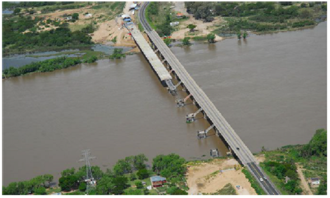 The route was long and consisted of different parts: raft, island, section of road, another raft. The bridge over the Colastiné River, which is an important work in itself, does not manage to manifest at a glance the impact that it meant for the territory, its geography and nature, everyday life and the citizens of both capitals. Traffic on National Route 168 (which crosses over the bridge) multiplied exponentially in the 21st century, not without fatal facts to its credit, and this demanded the modification of its appearance and use. When the National Route 168 was converted into a highway in 2010, the bridge was duplicated. Again, a novel constructive method was used in the country and in South America for a crossing of this scale: works were carried out by the system of successive launching of voussoirs, concreted in situ in a fixed prefabrication site (figure 2 and 3).