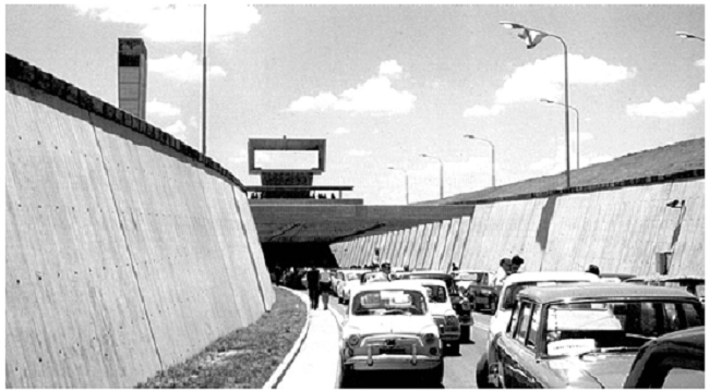 The three works were completed in a very short period of time (1967-1969-1971), and they were all carried out in the framework of developmental policies. During this period the new materials (although not all) began to be available nationwide. This, besides the new theoretical tendencies in architecture (systems theory, brutalism, megastructures, megaforms) and the outstanding role of the engineers (some of them military) made it possible for concrete to become people friendly. With these factors in mind, it is possible to comprehend a technological conception around the great spans and the aesthetics of concrete, understood as an acceptance of values and representations linked to certain technologies. This was already at stake in the discipline of architecture long before, but it appeared into the view of the passers-by from this moment onwards. The automobile boom and driving, understood as a civic activity and no longer as a technical capacity36, allowed the usual ride both in architectural works at an urban scale, and infrastructure at a territorial scale.