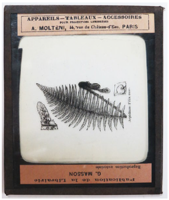 En Argentina, la adquisición de productos fotográficos y de proyección luminosa para los colegios nacionales y las escuelas normales se produjo hacia la década de 188024. En los expedientes de compras de estas instituciones figura la adquisición de placas y linternas de proyección de la marca Molteni (figura 2), "con arco a mano y lámpara de petróleo a 4 mechas"25 y de la linterna de Duboscq. Estos productos hacen referencia a los franceses Alfred Molteni y Jules Duboscq, dos de los más destacados fabricantes de linterna mágica de finales del siglo XIX en Francia; sus productos estaban dirigidos al público profesional y sus aparatos eran considerados de calidad por tener muy buenas ópticas acromáticas para la proyección26.
