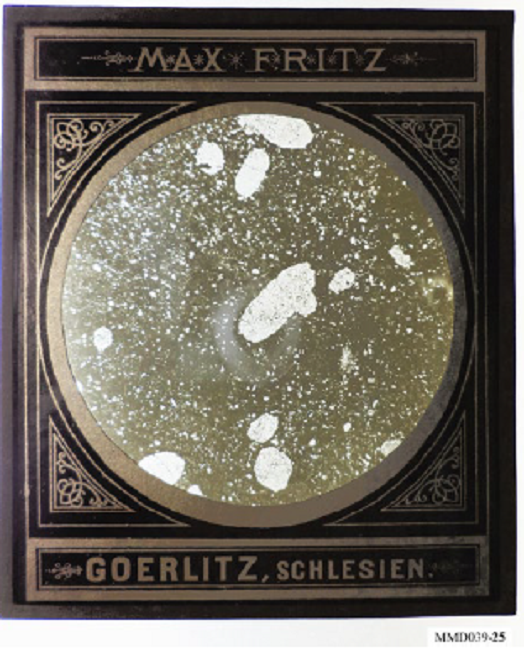 La mencionada librería Hachette y Cía. vendía las linternas mágicas y aparatos de proyección en la sección Óptica del apartado de Física, como la linterna de Duboscq, que vendía a 250 francos y otras de diversa calidad: una linterna mágica común costaba en esta casa comercial de entre 10 y 50 francos sin las lentes, aunque estas por separado podían costar de 50 a 2000 francos27. Hacia los inicios del siglo XX también se comercializó en el territorio argentino el material para proyección de la casa parisina Emile Deyrolle introducidas por las empresas argentinas Ángel Estrada y Cía. y de Otto Hess y Cía. a un costo de 1 franco cada placa de proyección. Otros materiales introducidos fueron las placas "Max Fritz" de Goerlitz (Görlitz)-Schlesien (figura 3), Alemania, de fotomicrografías de cristales, minerales y rocas, y de la casa Kosmos de Stuttgart y del Museo de Higiene de Dresden hacia 1900, importadas por la empresa argentina Lutz Ferrando, con contenidos relativos a la histología fisiológica, anatomía comparada e higiene general. Estos materiales formaron parte de aquellos productos utilizados ampliamente en la popularización de la ciencia de la época, que abarcaron todos los campos del saber y ámbitos formales e informales de enseñanza28.