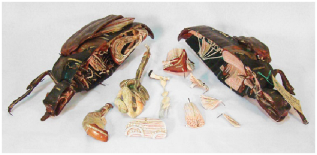 Dada también la dificultad de adquirir cadáveres para realizar estudios anatómicos, hacia inicios del siglo XIX se buscaron otras posibilidades materiales para la realización de modelos tridimensionales. Así surgió en Francia la técnica del papel maché como alternativa al uso de la cera o la madera31. El papel maché es una técnica antigua procedente de la cultura oriental y los productos obtenidos con este material fueron variados a lo largo del tiempo. La base de la técnica es la utilización de la celulosa, que puede obtenerse de las fibras del algodón o de la madera, como el álamo. La misma puede realizarse por capas o con pasta de papel triturado, a la que se le agrega un aglutinante como adhesivo y diversos aditivos para la perdurabilidad y la resistencia a los cambios climáticos, así como un acabado superficial al aceite o a base de proteínas. La combinación de diferentes elementos y técnicas en cada proceso permite la elaboración de materiales con diferentes propiedades físicas y estéticas como la dureza y la resistencia a los golpes, la liviandad, la versatilidad, el brillo o la transparencia32.