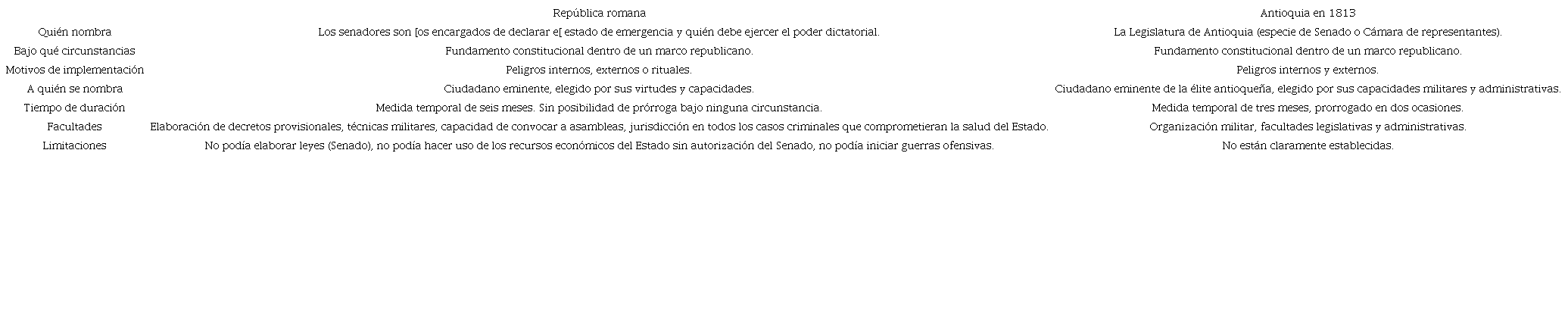 Si bien en el cargo de dictador se concentraban los poderes políticos en una sola persona, a la manera que lo hacían los reyes, es importante resaltar que esto era una medida temporal, por lo que se establecía claramente que este cargo no podía exceder los seis meses y no podía ser prorrogado bajo ninguna circunstancia. Igualmente, otra característica importante de este puesto era la separación entre quienes declaraban la emergencia y quien debía ejercer el poder dictatorial, es decir, que el dictador no se imponía ni se autoproclamaba, sino que eran los cónsules quienes establecían si había una situación de emergencia y designaban al ciudadano que debía ejercer el cargo42. En cuando a los poderes dictatoriales, estos no se reducían solo a lo militar -aunque eran un rasgo importante-, sino que el dictador también debía cumplir con otras actividades civiles como la convocatoria a asambleas o ejercer la jurisdicción en todos los casos criminales que comprometiesen la salud del Estado. En síntesis, este "ejercía todos los poderes que fueran necesarios para superar el peligro que había llevado a su designación"43, de manera que no estaba sujeto a las limitaciones que pesaban sobre las magistraturas ordinarias del Estado, excepto el hecho de que no podía elaborar leyes, ya que esto le correspondía siempre -incuso en tiempos de crisis- al Senado, motivo por el cual solamente podía elaborar decretos de carácter provisional. Además, el dictador no podía hacer uso de los recursos económicos del Estado sin el consentimiento del Senado, ni podía iniciar guerras ofensivas ya que estas siempre debían ser de carácter defensivo.