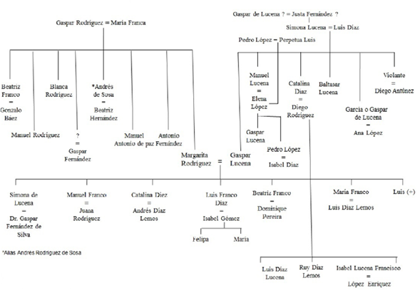Estos dos juicios se traen a colación porque son un ejemplo de lo ocurrido a la familia de origen del cristiano nuevo, el sujeto principal de este artículo, Luis Franco Díaz. Conocer los parientes de padre y madre y los familiares transversales y colaterales era importante para la Inquisición, pues ello demostraba que descendía de una familia de hebreos. Esto lo comprometía como cristiano nuevo y a ser considerado sospechoso de practicar el judaísmo en secreto (ver figura 1)