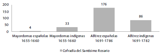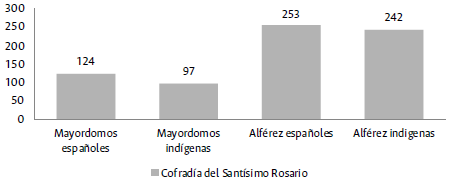 Desde 1638 hasta 1802 la diferencia de participación de mayordomos españoles con respecto a mayordomos indígenas fue de un 27 %, mientras que entre alféreces españoles y alféreces indios solo alcanzó un 11 %. Esto permite ver el grado de apropiación del sistema de cargos de la cofradía por parte de los indígenas y la importancia otorgada a la representación política en el cuerpo corporativo. Aunque participaron más como alférez que como mayordomos, los indígenas trataron de detentar un rol protagónico en la corporación como organizadores de la celebración religiosa.