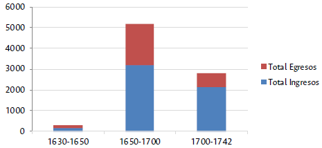 La monopolización del cargo de mayordomía en manos de una sola familia por más de cincuenta años evidencia como la corporación religiosa pasó de ser un cargo colectivo a un cargo individual, cuyo poder consistía en administrar el flujo de capital que circulaba en Moncorá. Cabe apuntar, además, que esa posición la familia Aquichire ganó el beneplácito del cura del pueblo. A finales del siglo XVII y en la primera mitad del siglo XVIII se mantuvieron constantes los ingresos; sin embargo, estos incrementaron durante el periodo de administración de la familia Aquichire, como puede observarse en la figura 3. Incluso de 1700 a 1742 se presentaron más ingresos que egresos. Esto confirma la apreciación del visitador eclesiástico de 1711; razón por la cual no se dudaba de los méritos de los Aquichire para continuar en el cargo, si se considera que el aumento de los ingresos en la cofradía era el objetivo primordial de la mayordomía. No obstante, se carece de documentación primaria complementaria que permita observar la forma en que la familia Aquichire aprovechó el cargo como una ventana de oportunidad a nivel político y social en el pueblo de Moncorá.