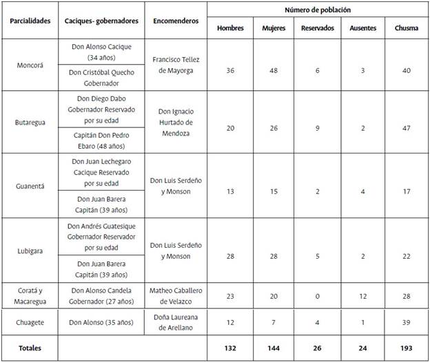 El conteo de indios de 1689 arrojó un total aproximado de 519 indígenas, conformado por 132 hombres, 144 mujeres y 26 reservados (hombres mayores de 50 años). Entre la población reservada estaban, por ejemplo, los indígenas Anton Dare y don Gastón Maldonado, indígenas dedicados a tocar chirimía en la iglesia y exentos de pago de tributo. Asimismo se contabilizaron 24 ausentes y 193 hijos vivos que tenían los matrimonios denominados como "chusma"36. La edad de los caciques, capitanes o gobernadores estaba entre 27 y 48 años. Algunos caciques eran útiles para el mantenimiento del orden hispánico mientras que otros como don Juan Lechegaro, cacique del pueblo de Guanentá, eran referenciados como "inútil porque no ha comparecido a las descripciones ni a dar cuenta de lo que ha sido de su cargo como es su obligación"37. La autoridad del encomendero sobre la comunidad se ejercía a través de la autoridad de los caciques y los capitanes; aquellos que no aseguraban el cobro del tributo y la organización de los indios para las actividades agrícolas y mineras eran señalados de esa forma.