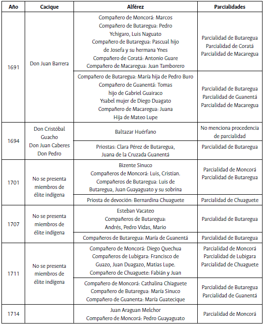 Las élites nativas se fueron desvaneciendo con el trascurrir del tiempo. En el caso que nos ocupa, la nobleza indígena del pueblo de Moncorá reinterpretó los cargos de la cofradía a través de la administración comunitaria de la corporación, la cual difería de la noción de asociaciones parroquiales basadas en el modelo europeo. Los indígenas concibieron la cofradía como un espacio de representación colectiva donde podían confluir indígenas de las diferentes parcialidades para ocupar el cargo de alférez. Allí su responsabilidad era organizar la festividad anual a la Virgen del Rosario el 2 de febrero y desarrollar diferentes actividades religiosas como procesiones y peregrinaciones. Los caciques y capitanes participaron como alférez desde 1691 hasta 1780 y su versión grupal permitió descentralizar la organización festiva y realizar las funciones religiosas en las parcialidades, es decir, en las unidades sociales en donde se conservaban los vínculos étnicos y familiares lejos de la "vida en policía" que suponía residir en el pueblo congregado. En ese sentido, en la Tabla 3 se ofrece un panorama de la participación de los caciques en las parcialidades.